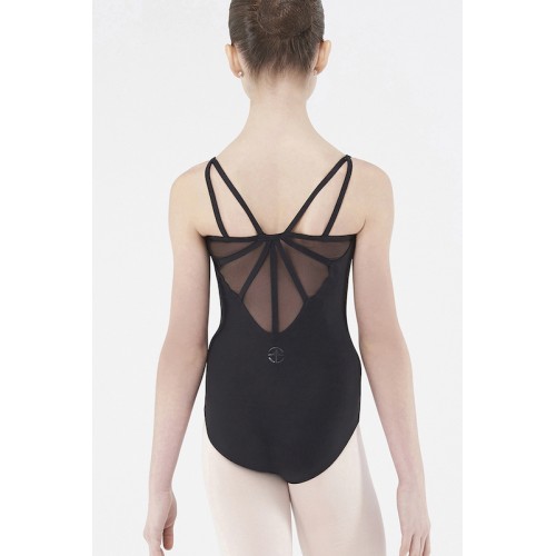Camisole strapped leotard with a clean front and a mesh back featuring thin straps plated on it. Full front lining.