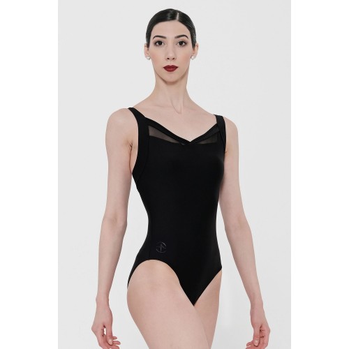 Microfiber camisole leotard detailed with sheer stretch tulle, revealing skin on the upper neckline and middle back through a small triangle cutout. Deep open back. Front lining.