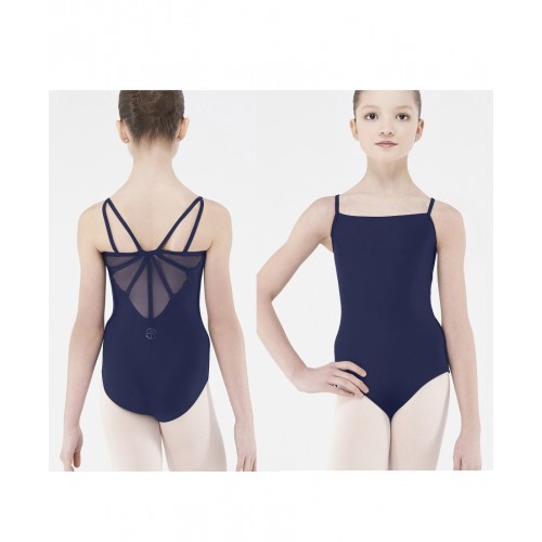 Camisole strapped leotard with a clean front and a mesh back featuring thin straps plated on it. Full front lining.